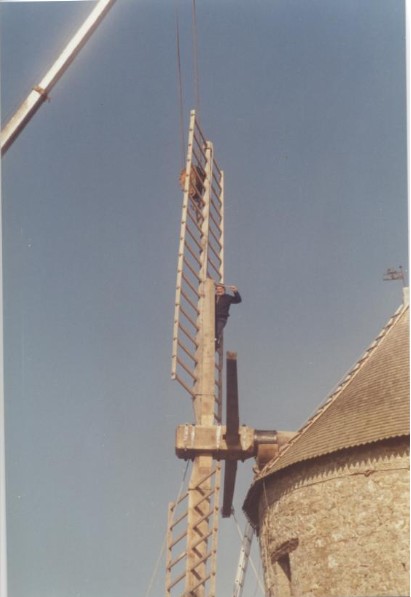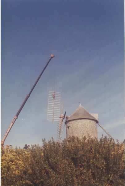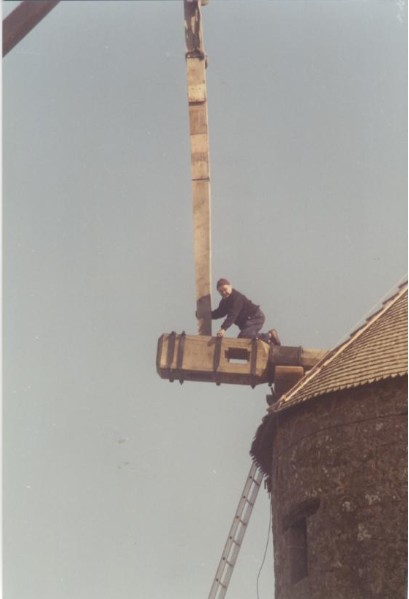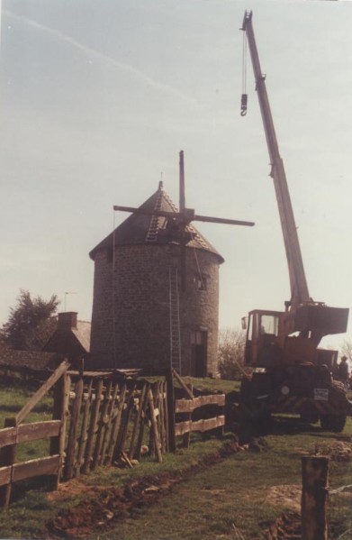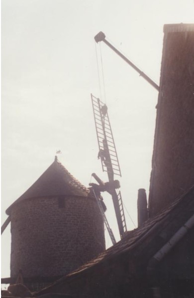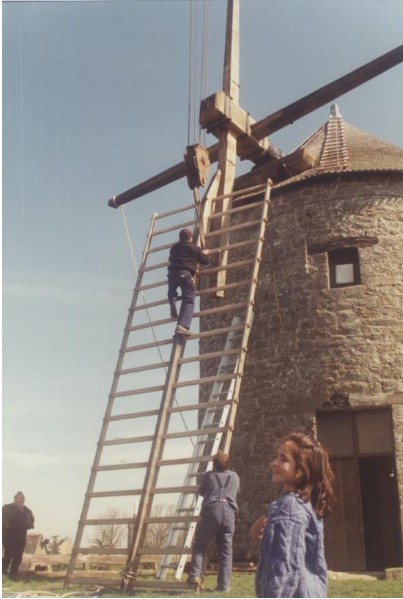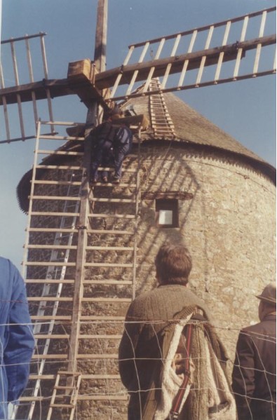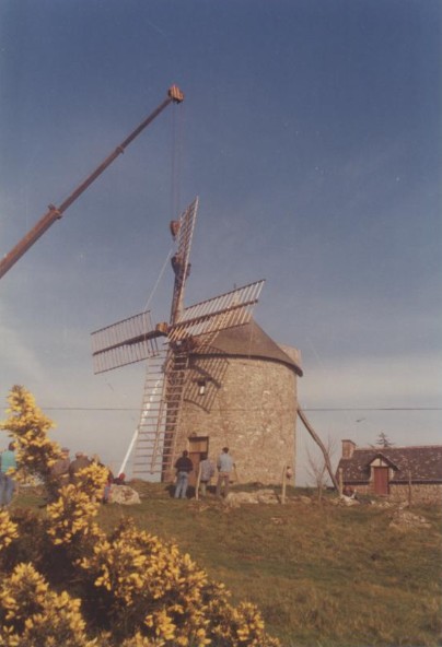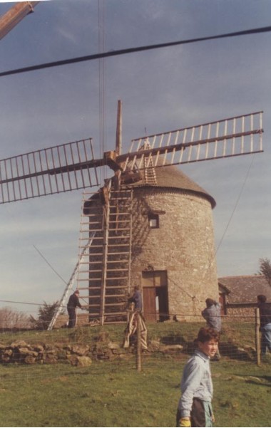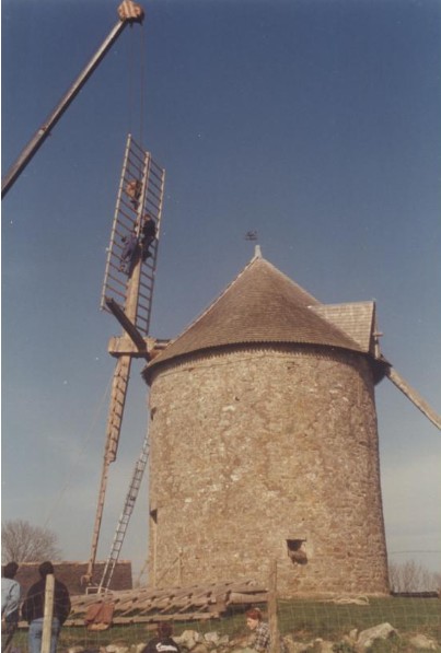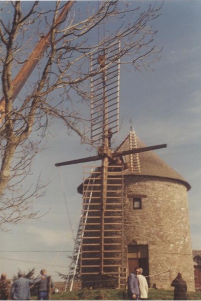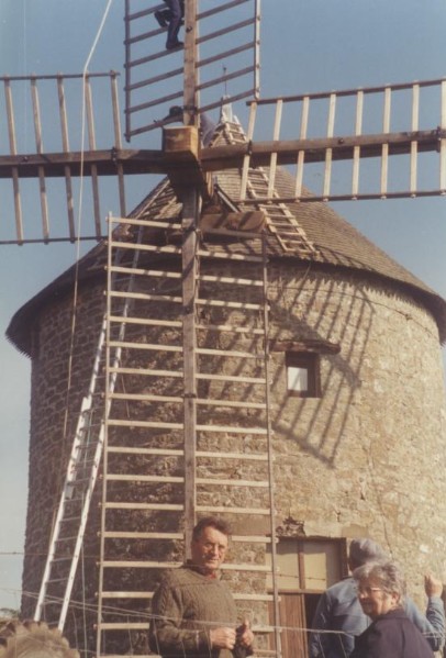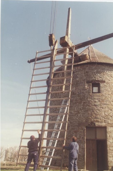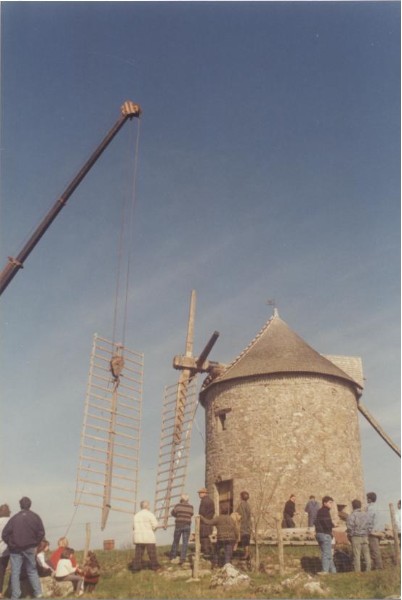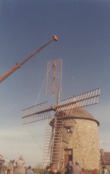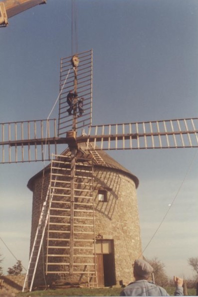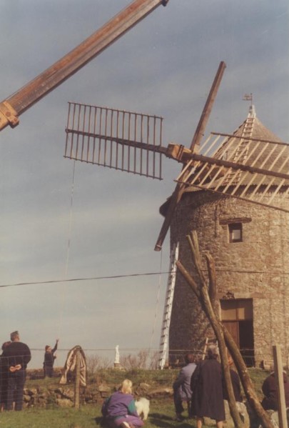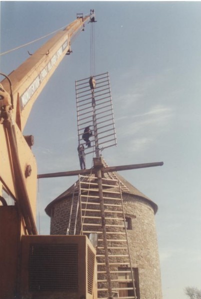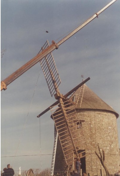 Photo de rénovation des ailes du moulin le 22 mars 1995 Partager : Cliquez pour partager sur Facebook(ouvre dans une nouvelle fenêtre) Facebook Cliquer pour partager sur X(ouvre dans une nouvelle fenêtre) X